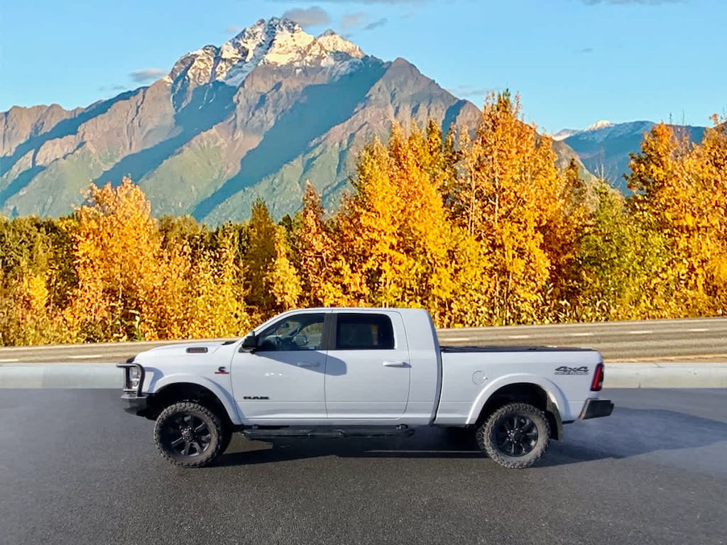 ENGINE: 6.7L I6 CUMMINS TURBO DIESEL Selective Catalytic Reduction (Urea), Dual 730 Amp Maintenance Free Batteries, Cummins Turbo Diesel Badge, Heavy Duty Engine Cooling, Supplemental Heater, 220 Amp Alternator, Tow Hooks, Diesel Exhaust Brake, Front Bumper Sight Shields, Capless Fuel Fill w/o Discriminator, Distribution Services Tracking, LARAMIE LEVEL B EQUIPMENT GROUP Mirror-Mounted Aux Reverse Lamps, Rain Sensitive Windshield Wipers, Power Adjustable Pedals w/Memory, Pwr Convenience Chrome Tow Mirrors w/Spotter & Memory, Remote Tailgate Release, 17 Speaker harman/kardon Premium Sound, Auto High Beam Headlamp Control, Exterior Mirrors w/Memory, Heated Second Row Seats, Foam Bottle Insert (Door Trim Panel), Radio/Driver Seat/Mirrors/Pedals Memory, Radio: Uconnect 5 Nav w/8.4 Display, Off-Road Information Pages, Disassociated Touchscreen Display, HD Radio, For Details, Visit DriveUconnect.com, For More Info, Call 800-643-2112, GPS Navigation, SiriusXM w/360L, All Radio Equipped Vehicles, Connected Travel & Traffic Services, All R1 High Radios, Alexa Built-In, Power Adjustable Convex Aux Mirrors, NIGHT EDITION Mirror-Mounted Aux Reverse Lamps, Black RAM Head Tailgate Badge, Wheels: 20 x 8.0 Black Painted Aluminum, Black Headlamp Bezels, Body Color Door Handles, Painted Front Bumper, Painted Rear Bumper, Body Color Grille Surround, Black Interior Accents, Black Exterior Mirrors, Power Adjustable Convex Aux Mirrors, Black Wheel Center Hub, Tires: LT285/60R20E OWL On/Off Road, Black Exterior Truck Badging, Exterior Mirrors w/Memory, Gloss Black Grille Billets/Accents, Black Tail Lamp Bezels, Pwr Convenience Black Tow Mirrors w/Spotter & Memory, TOWING TECHNOLOGY GROUP B Center Stop Lamp w/Cargo View Camera, Mirror-Mounted Aux Reverse Lamps, Surround View Camera System, Pwr Convenience Chrome Tow Mirrors w/Spotter & Memory, Exterior Mirrors w/Memory, Trailer Reverse Guidance, Power Adjustable Convex Aux Mirrors, PAINTED FLAT CAB-LENGTH SIDE STEPS, BLACK, LEATHER TRIMMED BUCKET SEATS Bucket Seats, Full Length Upgraded Floor Console, ANTI-SPIN DIFFERENTIAL REAR AXLE, TRANSMISSION: 6-SPEED AUTOMATIC (68RFE) Chrome Accent Shift Control. Ram Laramie with Bright White Clearcoat exterior and Black interior features a Straight 6 Cylinder Engine with 370 HP at 2800 RPM*.